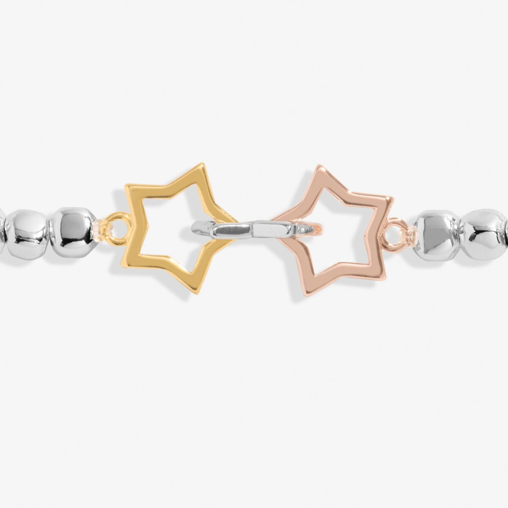 Made with beaded stretch material, this bracelet features interlinked star charms in silver, gold, and rose gold.