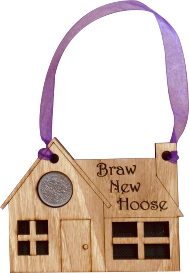 The sixpence is mounted onto a hanging oak veneered wooden house with tartan inserts, mounted on card and packaged in clear cellophane packets.