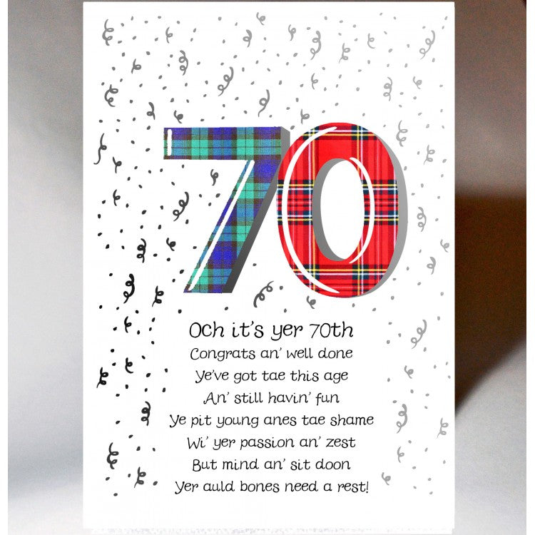 ***Price Includes Delivery ***  Scottish birthday card featuring tartan number '70' featuring Scottish Poem  Blank inside  Designed and printed in Scotland  Textured white card  Dimensions: 120mm x 170mm  We can send direct to recipient free of charge including a handwritten message inside .... simply add a note to your order (from cart page) including your message.