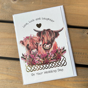Scottish Wedding Card - Highland Coos - Love Luck and Laughter