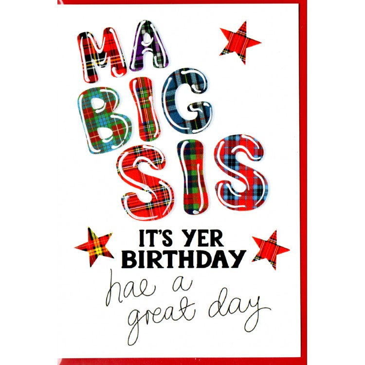 Scottish Birthday Card for your 'big sis' featuring the words 'Ma Big Sis, it's yer birthday, hae a great day!'